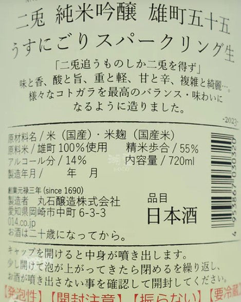 二兎 (二兔) 純米吟醸 雄町55 Sparkling うすにごり (薄濁) 生酒 720ml