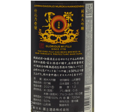 栄光冨士 (榮光富士) 日乃輪 純米大吟醸 無濾過 生原酒 720ml
