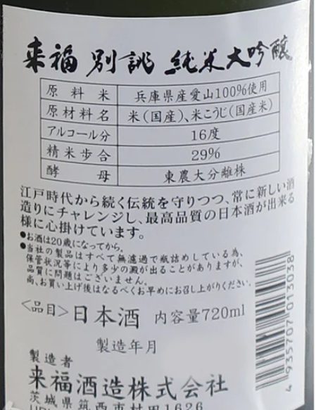 来福 別誂 純米大吟醸 播州愛山 二割九分磨き 720ml (木盒裝)